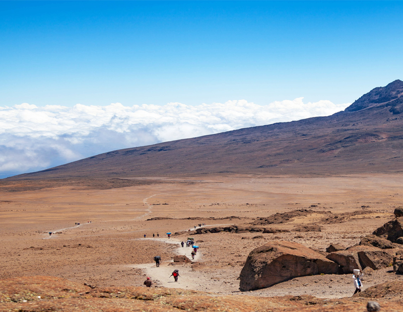 A steady trek across the alpine desert toward Kibo Hut, preparing for the summit attempt.